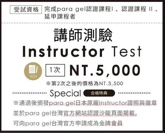 【Instructor Test/講師測驗】 想成為 para gel 講師為目標者必參加的測驗! 對象: 完成 para gel 認證課程 I、認證課程 II 、延甲課程者。 費用:每次 NTD 5,000 ※講師測驗由 para gel 認證講師親自審核。 ※通過後頒發 para gel 日本原廠的 Instructor 證照與徽章。 |